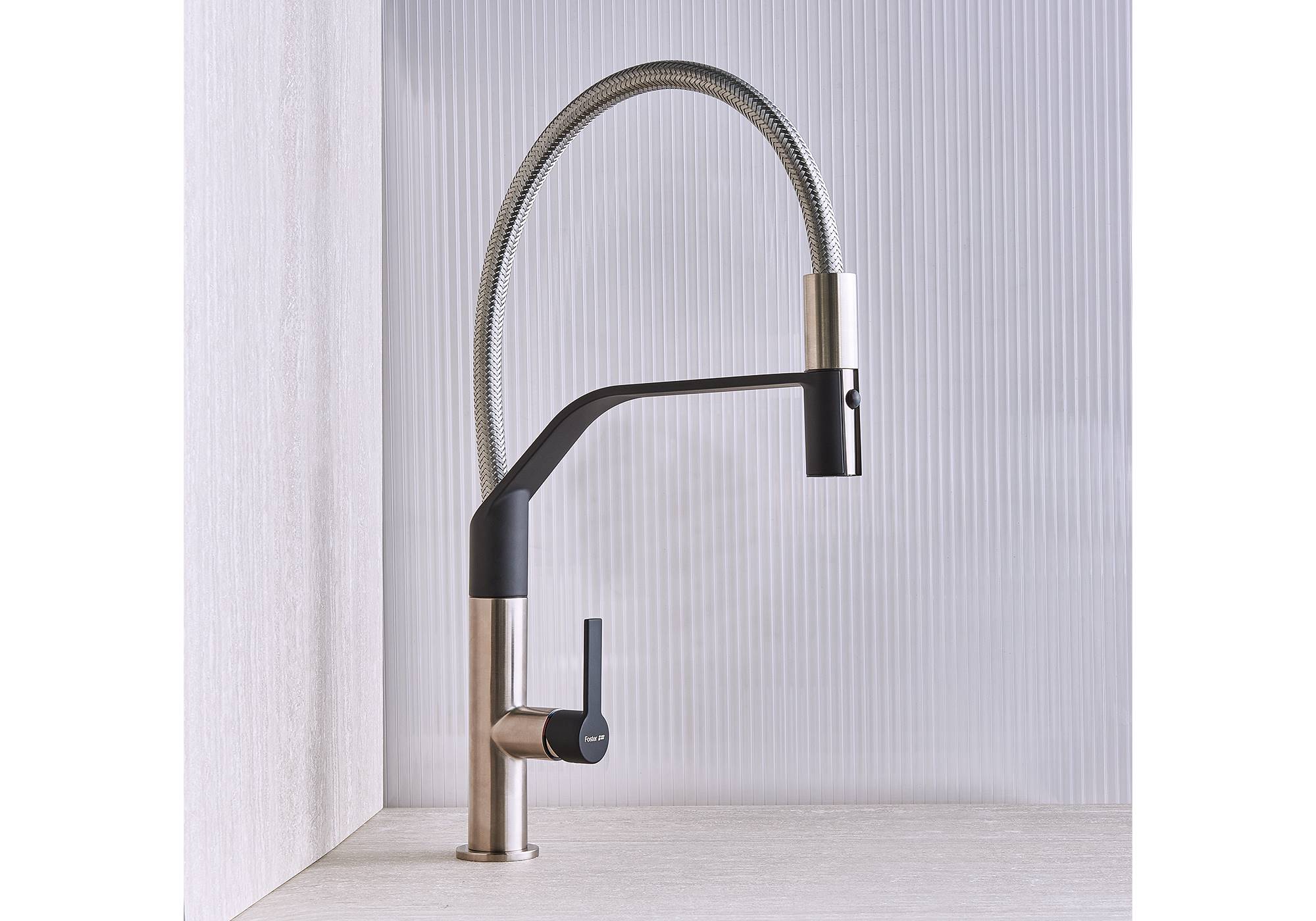带可提取淋浴的单杠杆混合器水龙头。采用 AISI 316 不锈钢制成。