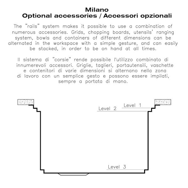 三重滑轨Foster Milano水槽使用巧妙的设计可以同时使用多个不同的附件。最上面一层,可以放置可滑动的创新的黑搁架,可以创造一个大的工作平面来冲洗食物和餐具。第二层用来放置和滑动通用配件,可以完成洗、冲、切、剁等多种功能。第三层靠近水槽底部,你可以放置冲洗过的食物餐具而不接触槽底,既可以沥水又不怕被槽底弄脏。