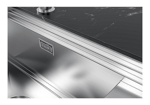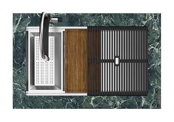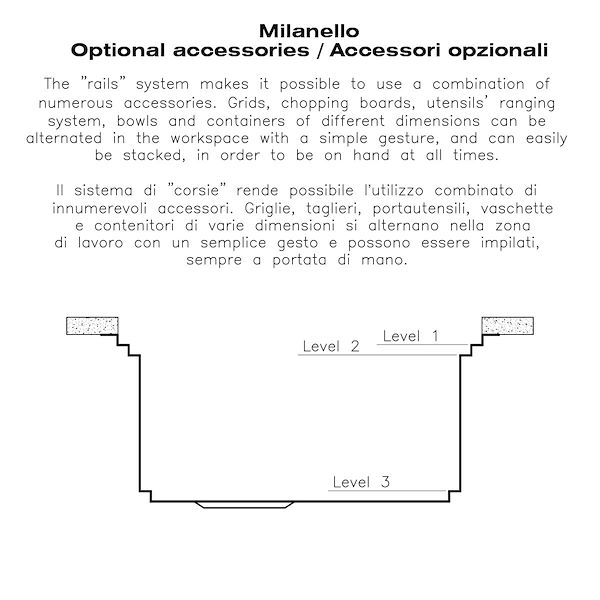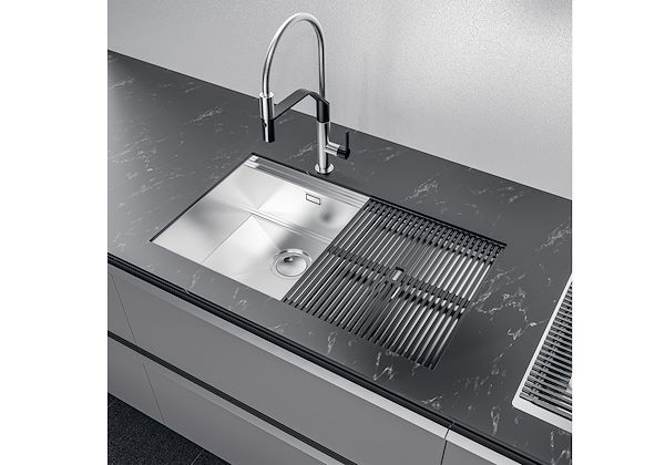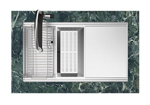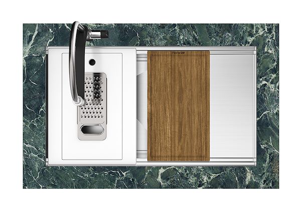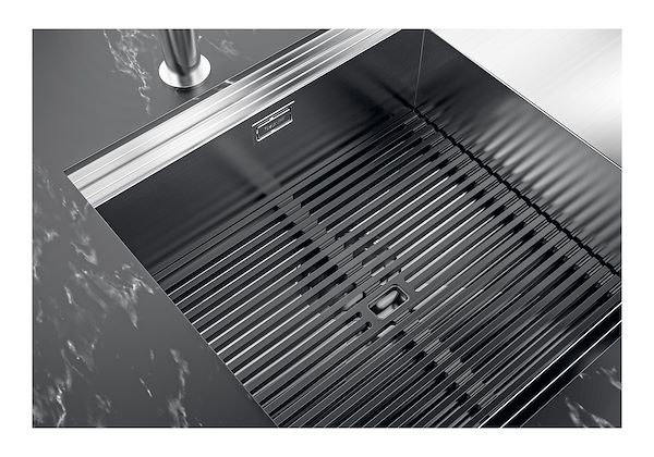 三重滑轨Foster Milano水槽使用巧妙的设计可以同时使用多个不同的附件。最上面一层,可以放置可滑动的创新的黑搁架,可以创造一个大的工作平面来冲洗食物和餐具。第二层用来放置和滑动通用配件,可以完成洗、冲、切、剁等多种功能。第三层靠近水槽底部,你可以放置冲洗过的食物餐具而不接触槽底,既可以沥水又不怕被槽底弄脏。
